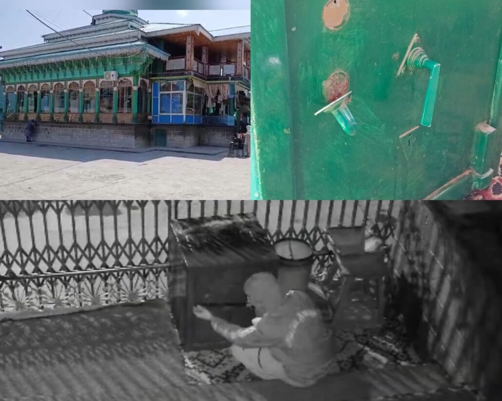 CCTV footage, posted by The Kashmiriyat, from the Khanqah shows two unidentified individuals forcibly entering the premises and prying open the donation box before fleeing with the cash.