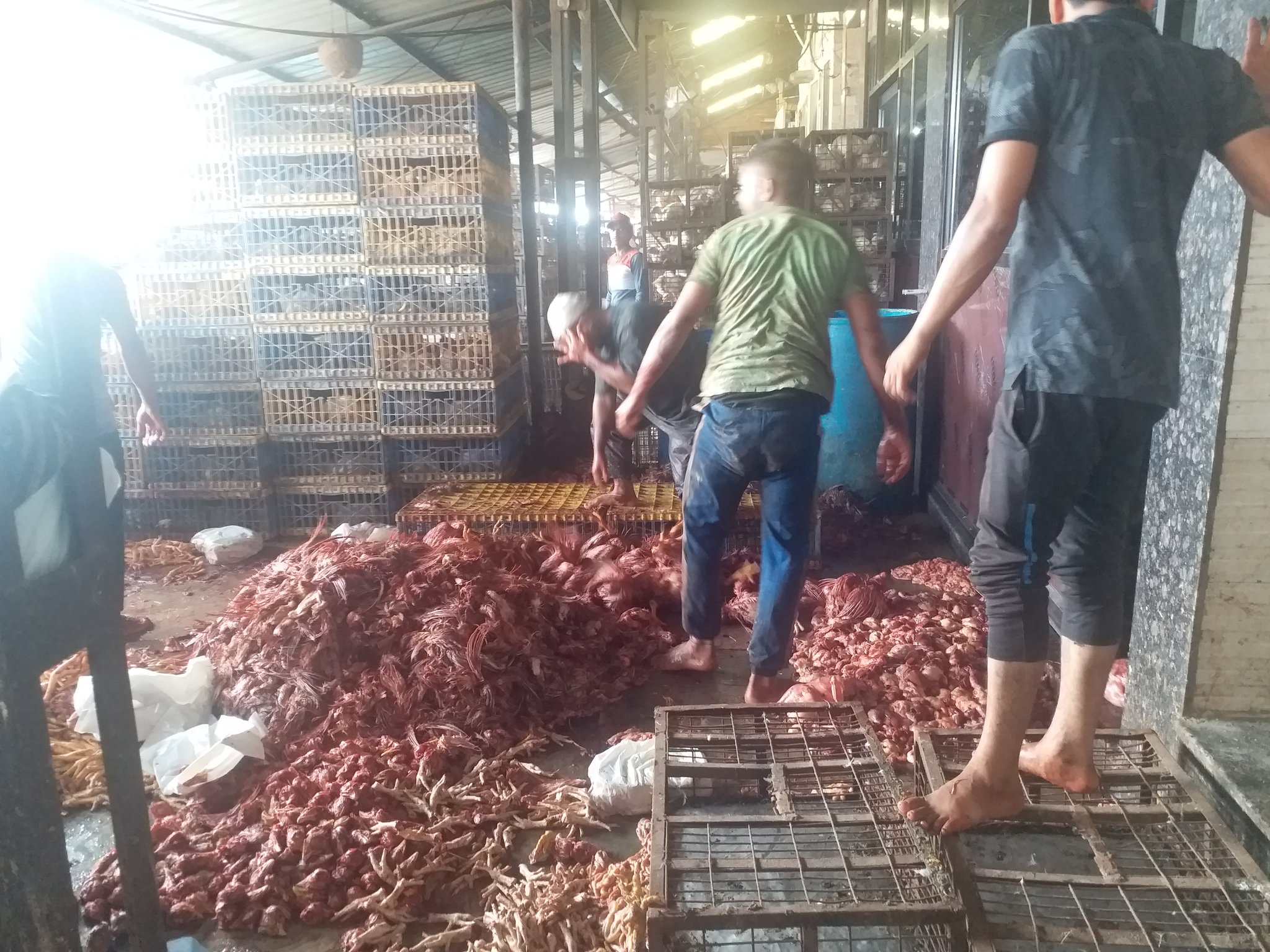Even at the retail level, the deception continues. Poultry shops across Jammu and Kashmir sell birds that are visibly sick, a practice so common that workers have a term for it, “fifty-fifty.” Half the stock may be compromised, but it is displayed with the same confidence as the healthy half. Sick birds are often pre-butchered into neat leg pieces or breast cuts before customers arrive, hiding their condition. Whole sick birds are sometimes concealed in blood-draining buckets at the back, ready to be swapped into the line when a customer asks for a live bird to be slaughtered.